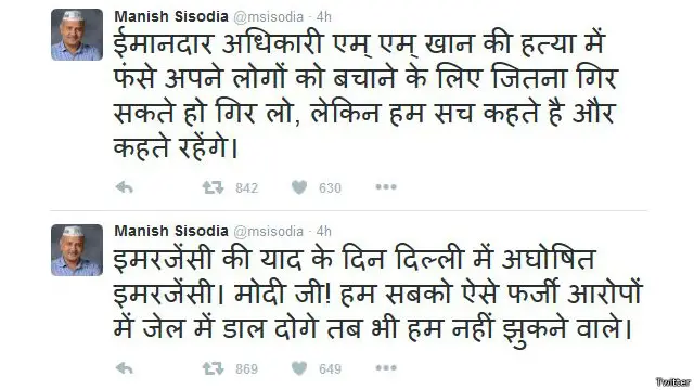 दिल्ली के उपमुख्यमंत्री मनीष सिसोदिया ने ट्वीट किया है, ''इमरजेंसी की याद के दिन दिल्ली में अघोषित इमरजेंसी. मोदी जी! हम सबको ऐसे फ़र्जी आरोपों में जेल में डाल दोगे तब भी हम नहीं झुकने वाले.''