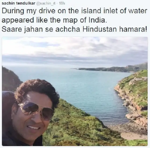 सचिन ने ट्वीट किया, "सफ़र के दौरान ये द्वीप दिखा जो भारत के नक्शे जैसा लगा. सारे जहाँ से अच्छा हिंदुस्तान हमारा."
