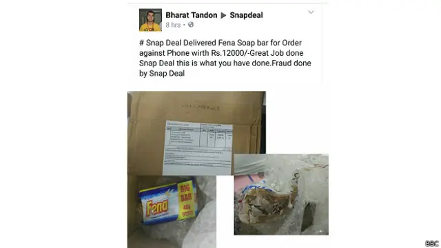 स्नैपडील डॉटकॉम से मंगवाए गए एक स्मार्टफ़ोन के लिए इंतज़ार कर रहे भरत ने जब अपने ऑफ़िस में कूरियर से आए डिब्बे को खोला तो उसमें 'फ़ेना' साबुन की दो टिक्कियां निकली.