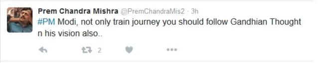 @PremChandraMis2 ने ट्वीट किया, "प्रधानमंत्री मोदी जी. सिर्फ़ रेल यात्रा नहीं, गांधी जी के विचारों का भी पालन कीजिए."