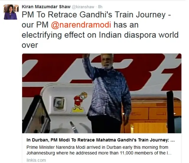 जानी-मानी उद्योगपति किरण मजूमदार शॉ लिखती हैं, "हमारे पीएम नरेंद्र मोदी का पूरे विश्व में बसे भारतीय समुदाय पर ज़बरदस्त प्रभाव है."