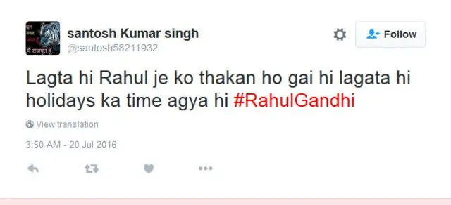 वहीं संतोष कुमार सिंह (@santosh58211932) कहते हैं- लगता है राहुल जी को थकान हो गई है. लगता है छुट्टियों का टाइम आ गया है.
