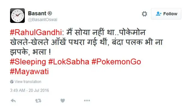 ट्विटर हैंडल @BasantOswal से बसंत लिखते हैं- राहुल गांधी: मैं सोया नहीं था....पोकेमोन खेलते-खेलते आँखें पथरा गई थीं, बंदा पलक भी ना झपके, भला!
