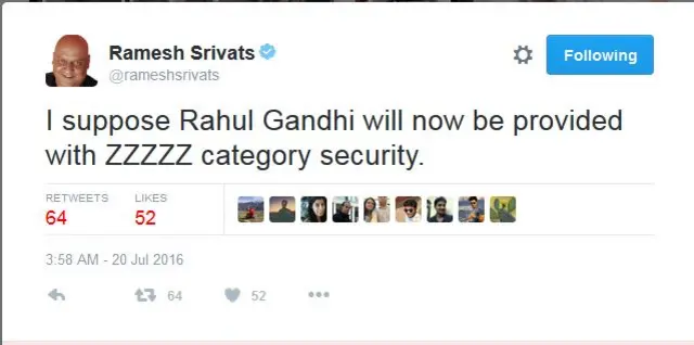 रमेश श्रीवत्स ने लिखा है- मुझे लगता है कि राहुल गांधी को अब ZZZZZ श्रेणी की सुरक्षा दी जाएगी.