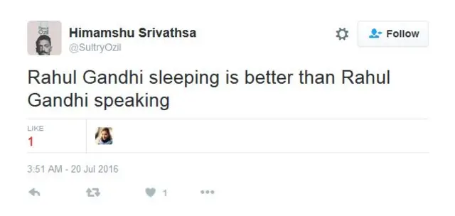 ट्विटर हैंडल @Mocktor से लिखा गया है- राहुल गांधी सो नहीं रहे थे. वे लोगों को प्रेरणा दे रहे थे, वे ख़ुद प्रेरणा रहे हैं और आगे भी लाखों लोगों को अपने पर जोक लिखने के लिए प्रेरणा देते रहेंगे.