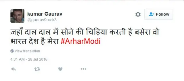 कुमार गौरव ने ट्विटर हैंडल @gaurav9rock3 से कहा है- जहाँ दाल दाल में सोने की चिड़िया करती है बसेरा वो भारत देश है मेरा.