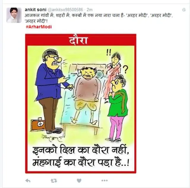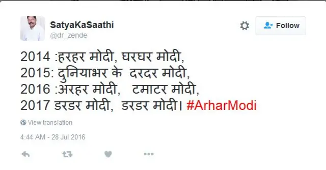 @dr_zende ने लिखा है- 2014: हर हर मोदी, घर घर मोदी, 2015: दुनियाभर के दर दर मोदी, 2016: अरहर मोदी, टमाटर मोदी, 2017: डर डर मोदी, डर डर मोदी.