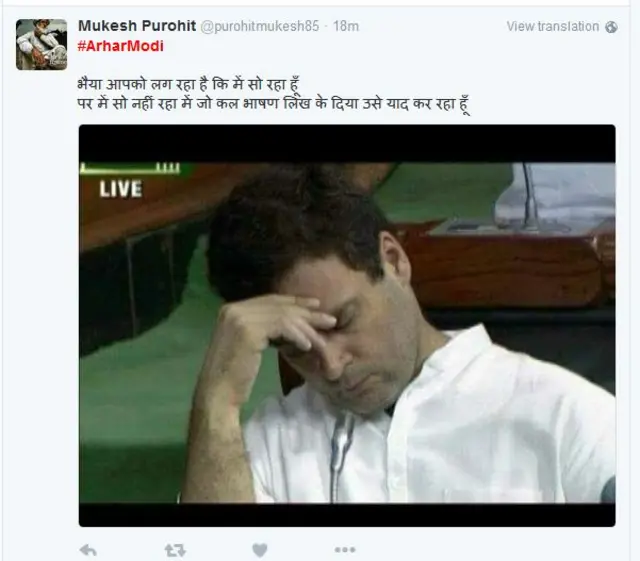 मुकेश पुरोहित (@purohitmukesh85) ने लिखा है- #ArharModi भैया आपको लग रहा है कि मैं सो रहा हूँ पर मैं सो नहीं रहा. जो कल भाषण लिख के दिया था, मैं उसे याद कर रहा हूँ.