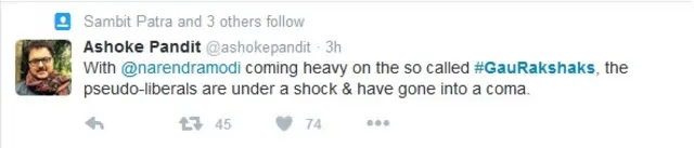 वहीं अशोक पंडित ने @ashokepandit से ट्वीट किया, "तथाकथित गौरक्षकों पर मोदी के सख्त बयान से छद्म उदारवादी सदमें में हैं और कोमा में चले गए हैं."