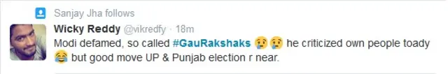 विकी रेड्डी ने @vikredfy से लिखा, "मोदी ने तथाकथित गौरक्षकों को बदनाम किया. उन्होंने अपने ही लोगों की आलोचना की. अच्छा क़दम. यूपी और पंजाब चुनाव नज़दीक हैं."