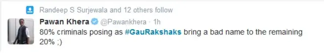 पवन खेरा ने @Pawankhera से लिखा, "ख़ुद को गौरक्षक बताने वाले 80 फ़ीसदी लोग बाक़ी बचे 20 फ़ीसदी लोगों को बदनाम कर रहे हैं."