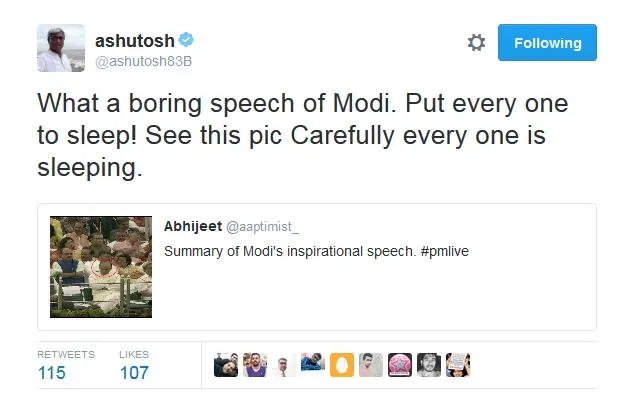 उन्होंने कुछ लोगों की तस्वीर वाला एक ट्वीट रिट्वीट करते हुए लिखा, "मोदी का भाषण कितना ऊबाऊ था. हर किसी को नींद आ रही थी! ध्यान से तस्वीर देखिए हर कोई सो रहा है."