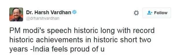 एक अन्य केंद्रीय मंत्री हर्षवर्धन ने ट्वीट किया, "प्रधानमंत्री का भाषण ऐतिहासिक, दो साल के छोटे समय की ऐतिहासिक उपलब्धियों के साथ, ऐतिहासिक रूप से लंबा था. भारत को आप पर गर्व है."