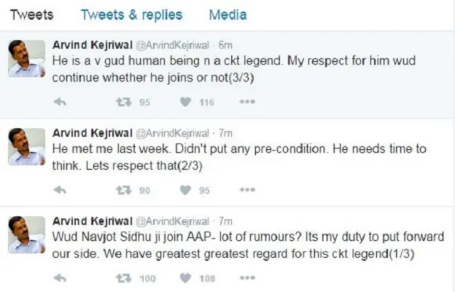 केजरीवाल ने ट्वीट किया, "नवजोत सिद्धू के आप में शामिल होने को लेकर कई अफवाहें चल रही हैं? ये मेरी ज़िम्मेदारी है कि मैं हमारा पक्ष सामने रखूं. इस दिग्गज क्रिकेटर के प्रति हमारा बहुत सम्मान है."