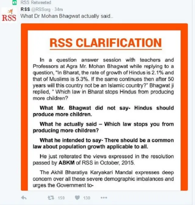 इसमें कहा गया है- "एक सवाल पूछा गया था कि भारत में हिंदुओं की ग्रोथ 2.1 प्रतिशत है और मुसलमानों की 5.3 प्रतिशत. अगर जनसंख्या की यही रफ़्तार जारी रही तो अगले 50 साल में क्या ये देश इस्लामिक देश नहीं बन जाएगा? भागवत जी ने इसका जवाब दिया, भारत में कौन सा क़ानून हिंदुओं को अधिक बच्चे पैदा करने से रोकता है?"