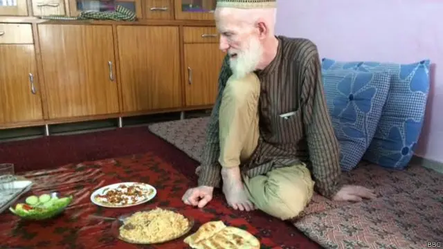 उनकी सफ़ेद लहलहाती हुई दाढ़ी, सिर पर अफ़ग़ान टोपी और पैजामे की जगह सिक्स-पॉकेट वाली ख़ाकी पैंट से नज़र हटाना मुश्किल है.