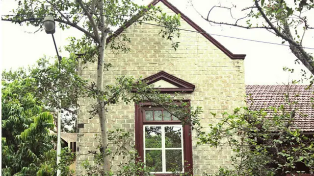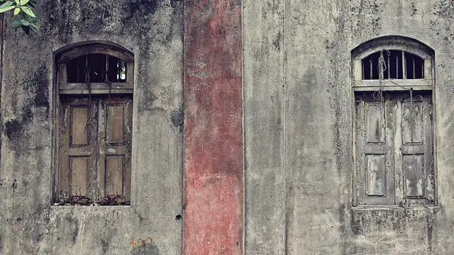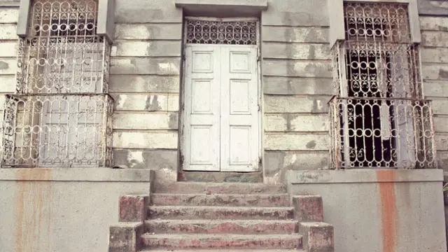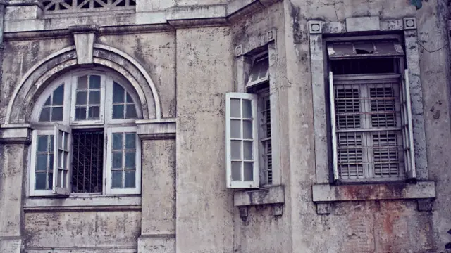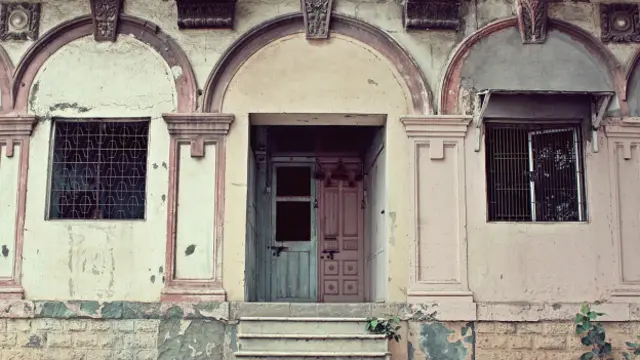 एक वीरानी संपत्ति जिसकी बालकॉनी नक्काशीदार और लकड़ी के खानों की शायद स्टील के खम्बे से मरम्मत की गई है. मकान के हालात बता रहे हैं कि इसे फ़िलहाल छोड़ दिया गया है.