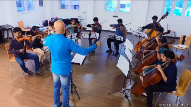 वो भारत में सिम्फनी ऑर्केस्ट्रा की तर्ज़ पर इसे बनाना चाहते थे. उनका कहना है कि तार वाले म्यूज़िक इंस्ट्रुमेंट बजाना कठिन होता है इसलिए वो चाहते थे कि ये बच्चे इस पर पूरी तरह से महारत हासिल करें.