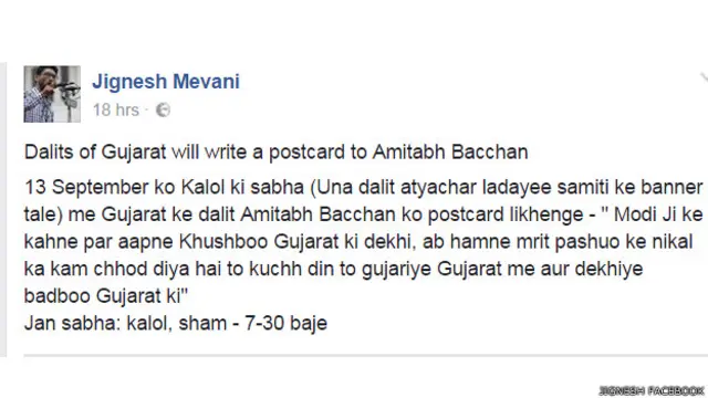 गुजरात के कलोल में आयोजित होने वाले एक सभा में दलित, उना दलित अत्याचार संघर्ष समिति के बैनर तले अमिताभ को लिखेंगे- ''मोदी जी के कहने पर आपने खुशबू गुजरात की देखी. अब हमने मृत पशुओं की खाल निकालने का काम छोड़ दिया है. इसलिए कुछ दिन तो गुजारिए गुजरात में और देखिए बदबू गुजरात की.''