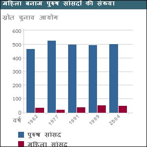 2004 के लोक सभा चुनाव में 355 महिलाओं ने चुनाव लड़ा था जिनमें से 45 चुनी गईं यानी केवल 8.3 फ़ीसदी प्रतिनिधित्व. 1962 के बाद हुए लोकसभा चुनावों में से सबसे ज़्यादा महिलाएँ 1999 में चुन कर आई थीं- कुल 49 सासंद यानी अर्धशतक से एक कम. पिछले आँकड़ों पर नज़र दौड़ाएँ तो (1984 को छोड़कर) 1996 से पहले हुए चुनावों में महिला सांसदों की गिनती 40 तक भी नहीं पहुँची थी. 1996 में 40 तो 1989 में 29 महिला सांसद चुनी गई थीं. सबसे कम महिलाएँ 1977 में चुनी गई जब ये संख्या केवल 19 रह गई थी. महिला सांसद