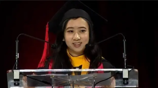 यांग को यूनिवर्सिटी ने ही बोलने के लिए चुना था. उन्होंने चीन के प्रदूषण में चेहरे पर मास्क पहनने के बरअक़्स अमरीका की 'मीठी और ताज़ी' हवा की बात की.