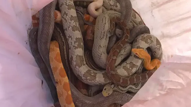 इन सांपों में एक रॉयल अजगर और 15 कॉर्न स्नैक (अमरीका के दक्षिण पूर्वी हिस्से के खेतों में पाए जाने वाला सांप जिससे नुकसान नहीं पहुंचता) शामिल थे. इन्हें दो गुलाबी तकिए के खोलों में रख गया था. उनके जिप लॉक थे और वे टेप से बंधे हुए भी थे.