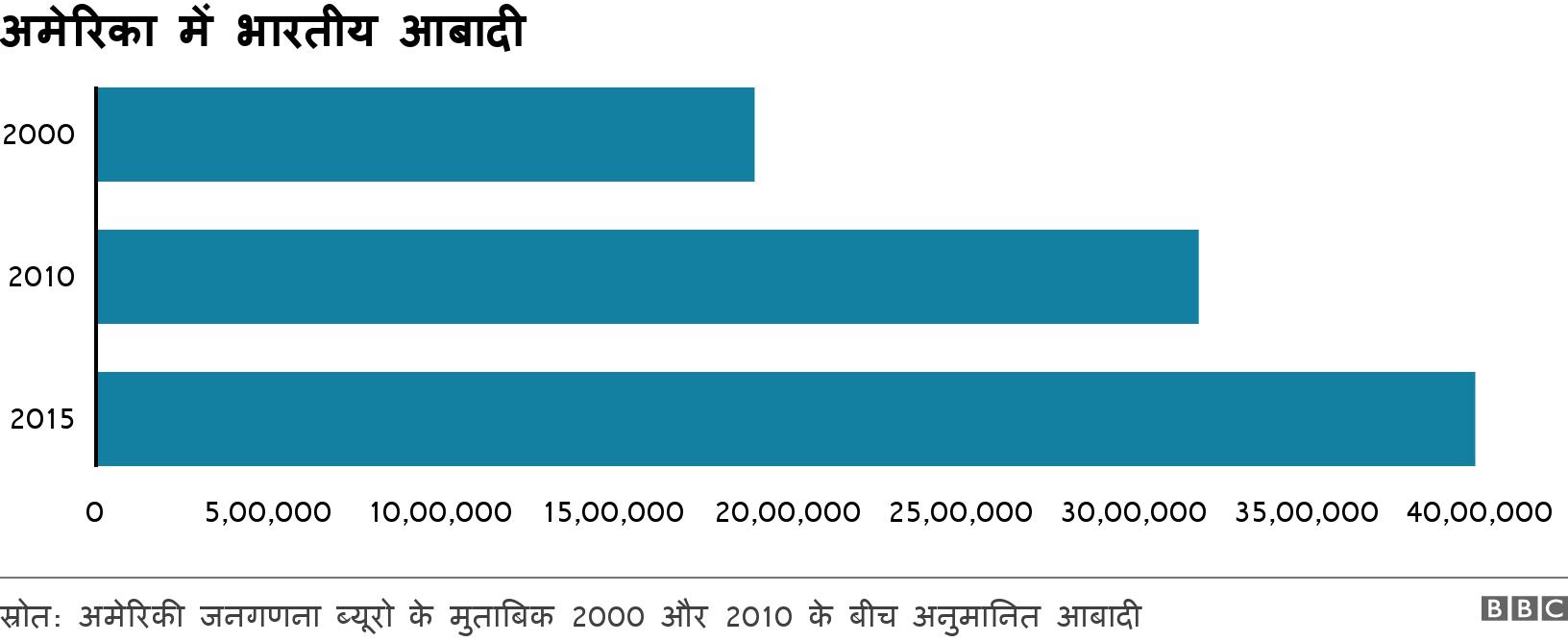 अमेरिकी जनगणना के आंकड़ों के मुताबिक़ साल 2000 में अमेरिका में 19,00,000 भारतीय रह रहे थे जो साल 2015 तक लगभग दोगुने होकर 39,82,000 हो चुके थे.