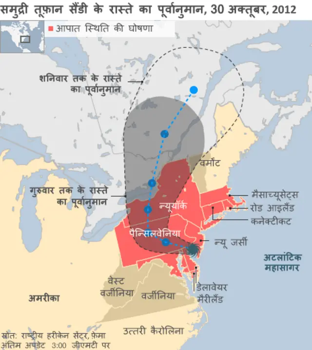 मूसलाधार बारिश, तेज हवाओं और ऊंची लहरों से साथ चक्रवाती तूफान सैंडी अमरीका के पूर्वी तट को छूने के बाद न्यूयॉर्क भी पहुंच गया है. अमरीकी राष्ट्रपति बराक ओबामा ने ‘सैंडी' को 'बड़ी आपदा' घोषित किया है.