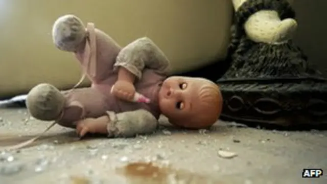 बीबीसी संवाददाता पॉल डैनहर ने घटनास्थल से ट्वीट किया है, “एक माँ अपने नष्ट हो चुके घर में है,..वो अपने बेटी की गुड़िया उठा रही है, उससे धूल हटा रही है.”