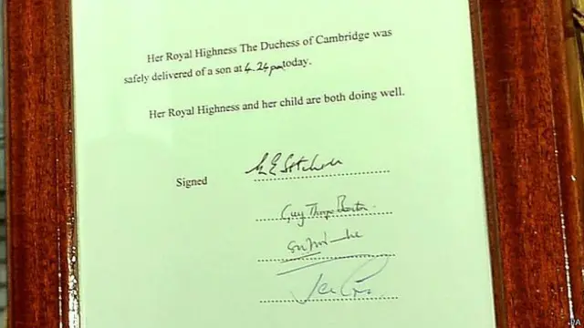 शाही बच्चे के पैदा होने की खबर परंपरा के अनुसार बकिंघम पैलेस में सुसज्जित पट्टिका पर प्रदर्शित की गई है.