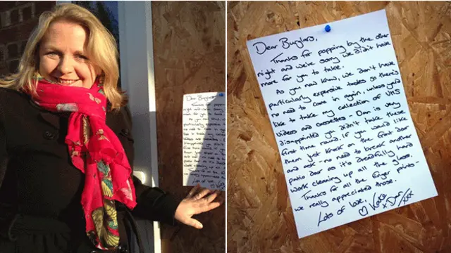 36 वर्षीय केट बैरेट ने पत्र में लिखा है कि वह और उनके साथी डैन ओवेंस निराश हैं क्योंकि चोरों ने उनके घर में रखे कैसेट और वीएचएस वीडियो संग्रह को नज़रअंदाज़ कर दिया.