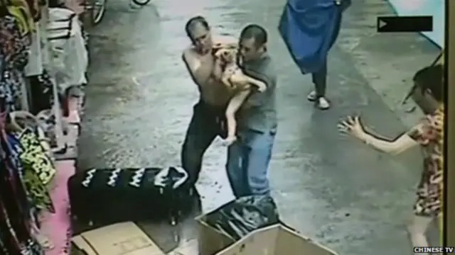 चीनी टीवी ने इस घटना के फुटेज का प्रसारण किया है जिसमें दिखाया गया है कि कैसे बच्चा गिर रहा है और दो व्यक्ति उसे पकड़ने के लिए दौड़ते हैं और अंत में एक व्यक्ति उसे सफलतापूर्वक पकड़ लेता है.