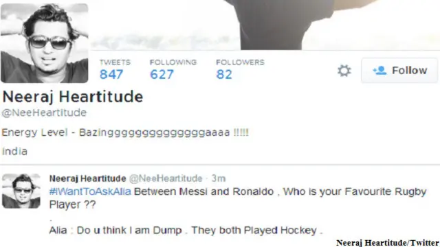 नीरज हारटीट्यूड कहते हैं, "मैं आलिया से पूछना चाहता हूँ कि मेसी या रोनाल्डो में से उनका चहेता रग्बी खिलाड़ी कौन है? अलिया: आप मुझे मूर्ख समझते हैं ये दोनो हॉकी खेलते हैं."