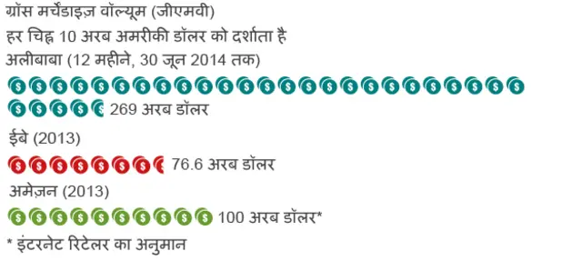 अलीबाबा ने बताया कि इस साल जून तक उसने 296 अरब डॉलर का जीएमवी हासिल किया. ये पिछले ईबे जीवीएम का लगभग चार गुना है. अमेजन अपने जीवीएम आंकड़े प्रकाशित नहीं करती लेकिन उद्योग जगत का अनुमान है कि पिछले साल ये 100 अरब डॉलर रहा.