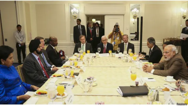 भारतीय प्रधानमंत्री नरेंद्र मोदी अमरीका में लगातार लोगों से मिल रहे हैं. ये तस्वीर है सोमवार की सुबह बड़ी कंपनियों के सीईओ के साथ ब्रेकफास्ट की. हालांकि प्रधानमंत्री ने बस गरम पानी ही पिया.