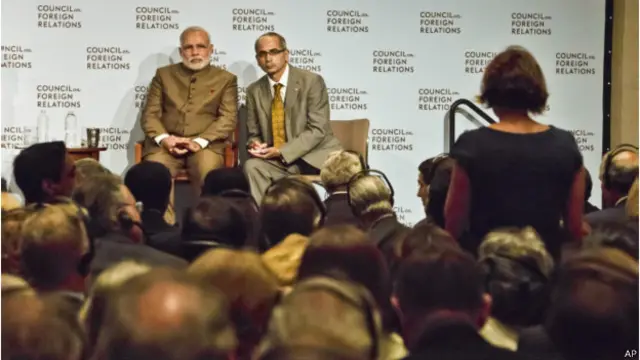 काउंसिल ऑन फॉरेन रिलेशन को संबोधित करने के बाद वहां मौजूद लोगों के सवालों का जवाब देते हुए मोदी. साथ में अनुवादक हैं.
