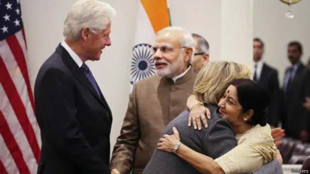पू्र्व राष्ट्रपति बिल क्लिंटन के साथ प्रधानमंत्री मोदी. साथ में विदेश मंत्री सुषमा स्वराज और हिलेरी क्लिंटन को गले मिलते देखा जा सकता है.