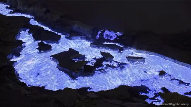 जब इससे लावा निकलता है तो तेज़ तापमान से सल्फ़ूरिक गैसों का तापमान भी बढ़ता है. फिर ये गैसें हवा में मौजूद ऑक्सीजन के संपर्क में आते ही नीला धुंआ बनाती हैं. इससे ऐसा लगाता है कि नीला लावा ज्वालामुखी ने निकल रहा है.