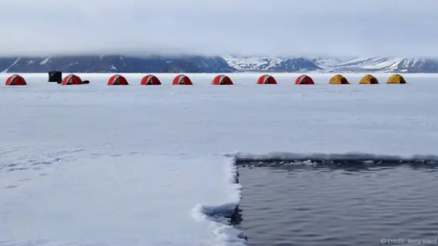 इस तस्वीर में जमा हुआ समुद्र दिख रहा है. यहां अमूमन तीन मीटर की गहराई तक समुद्री पानी जमा होता है, लेकिन ऊपर के कुछ सेंटीमीटर का पानी पिघला हुआ भी था.