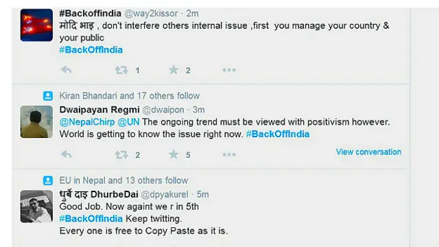 नेपाल में ट्विटर इस्तेमाल करने वाले कुछ लोगों ने भारत पर जान-बूझकर ईंधन की आपूर्ति रोकने का आरोप लगाया है.