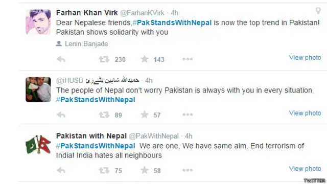 नेपाल के संविधान पर भारत के रुख़ को लेकर पाकिस्तान में ट्विटर यूजर हैशटैग <link type="page"><caption> #PakStandsWithNepal</caption><url href="https://twitter.com/hashtag/PakStandsWithNepal?src=hash" platform="highweb"/></link> के जरिए भारत की निंदा और नेपाल का समर्थन कर रहे हैं.