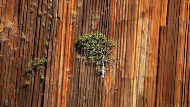 ऑर्गन पाइप्स के तांबे और बेसाल्ट की चट्टानों के बीच प्रकृति की मौजूदगी भी साफ़ नज़र आती है. अब इसी तस्वीर में देखिए, तांबे के रंग वाली चट्टानों के बीच एक पौधा पनप ही आया है.