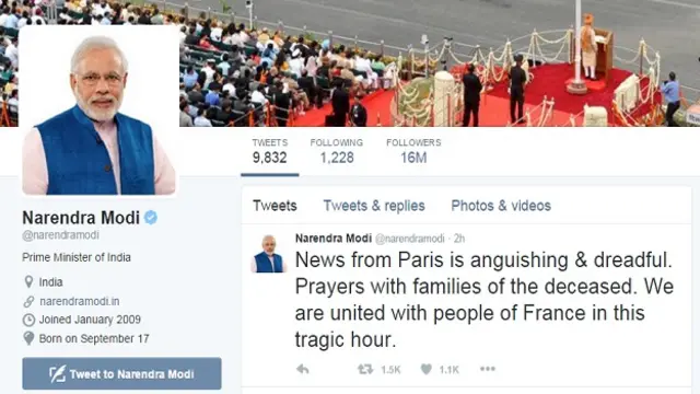 भारत के प्रधानमंत्री नरेंद्र मोदी ने ट्वीट कर लिखा है, "पेरिस से आ रही ख़बर दर्दनाक और दुखद है. मारे गए लोगों के साथ हमारी संवेदनाएँ हैं. इस घड़ी में हम पेरिस के लोगों के साथ हैं."