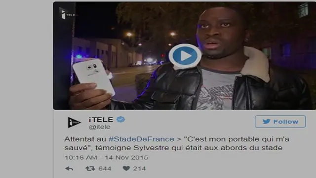 फ्रेंच भाषा के टीवी चैनल आईटेली ने एक ऐसे व्यक्ति का इंटरव्यू दिखाया जो स्टेट दी फ्रांस के बाहर हुए धमाके के समय उसके पास ही मौजूद था.