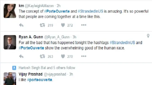पेरिस में हुए हमलों के बाद से कई लोग शहर में फँसे हुए हैं .ऐसे लोगों की मदद के लिए ट्विटर पर #PorteOuverte नाम से हैशटैग चलाया जा रहा है ताकि फँसे हुए लोग रहने के लिए मदद माँग सके. हमलों में 120 लोग मारे जा चुके हैं.