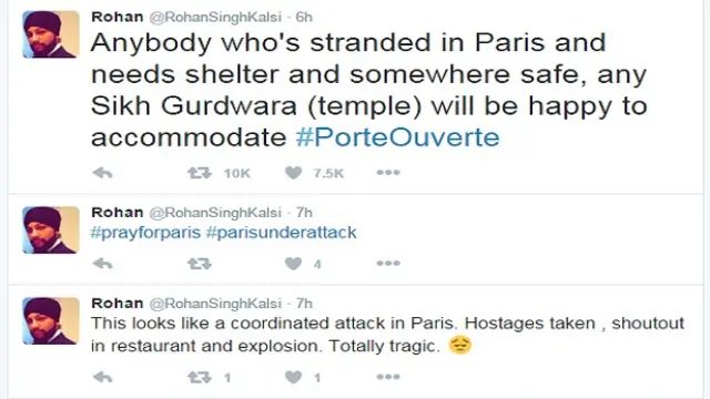 हैशटैग#PorteOuverte का उपयोग करते हुए रोहन सिंह ने व्यक्ति ने लिखा है, "अगर कोई व्यक्ति पेरिस में असहाय हो और उसे किसी सुरक्षित जगह में शरण लेने की ज़रूरत हो तो किसी भी सिख गुरुद्वारे को उसे अपने यहां रखकर खुशी होगी."