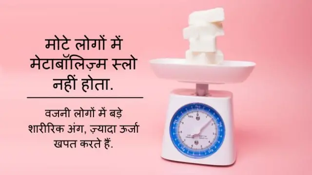 1. मोटे लोगों में मेटोबॉलिज़्म की दर कम नहीं होती. लोग अमूमन मानते हैं कि मोटे लोगों में मेटाबॉलिज़्म की दर कम होती है. लेकिन ऐसा होता नहीं है क्योंकि मोटे लोगों के शारीरिक अंग बड़े होते हैं और पतले लोगों की तुलना में वे ज्यादा ऊर्जा खर्च करते हैं. ऐसे में मोटे लोगों के मेटाबॉलिज़्म की दर ज़्यादा होती है. इस बारे में ज़्यादा जानकारी के लिए <link type="page"><caption> देखें- जर्नल ऑफ़ न्यूट्रीशनल साइंसेज़</caption><url href="http://www.ncbi.nlm.nih.gov/pubmed/9467223" platform="highweb"/></link>.