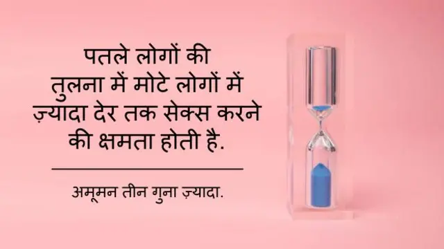 5. तुर्की के अनुसंधानकर्ताओं ने 200 पुरुषों में सर्वे करने के बाद पाया है कि जिनका वज़न अनुपात ज़्यादा होता है, यानि बीएमआई (बॉडी माल इंडेक्स) ज़्यादा होता है, वह बिस्तर पर ज़्यादा देर तक संसर्ग करने की क्षमता रखते हैं. ऐसे लोगों का औसतन संसर्ग का समय 7.3 मिनट होता है जबकि पतले लोग 2 मिनट में स्खलित हो जाते हैं. शायद पतले लोगों में टेस्टोस्टोरोन की मात्रा कम हो जाती है, यह बहुत मोटे लोगों के साथ भी होता है. मोटे लोग में सेक्स करने की क्षमता भले ज़्यादा होती है लेकिन उन्हें इसे शुरू करने में वक़्त लगता है. कई बार ज़्यादा वज़नी लोगों में सेक्स करने लायक़ इरेक्शन नहीं हो पाता है.(<link type="page"><caption> स्रोत- इंटरनेशनल जर्नल ऑफ़ इंपोटेंस रिसर्च</caption><url href="http://www.nature.com/ijir/journal/v22/n4/pdf/ijir201011a.pdf" platform="highweb"/></link>)