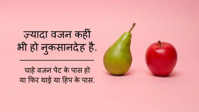 2. अगर आपका पेट काफ़ी वज़नी हो, आप मोटे हों, तो आपके शरीर को सेब जैसा कहा जाता है जबकि अगर आपके हिप और थाई वज़नी हों तो उसे नाशपती के आकार का कहा जाता था. पहले यह माना जाता था कि सेब के आकार वाले लोगों में हृदय संबंधी रोग होने का ख़तरा ज़्यादा होता है, डायबिटीज़ होने की आशंका ज़्यादा होती है. लेकिन हाल में कैलिफ़ोर्निया यूनिवर्सिटी के अध्ययन में देखा गया है कि आपके शरीर का आकार चाहे जो हो, लेकिन अगर आपका वज़न ज़्यादा है तो वो ख़तरनाक है. (<link type="page"><caption> स्रोत- यूनिवर्सिटी ऑफ़ कैलिफोर्निया, डेविस</caption><url href="http://www.ucdmc.ucdavis.edu/publish/news/newsroom/7365" platform="highweb"/></link>)