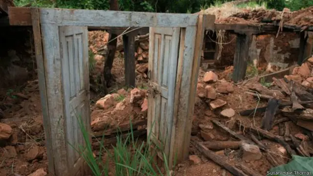 दूसरी तरफ़ हम साबिन के घर के बचे हुए हिस्से पर चढ़ते हैं. वहां केवल दो दरवाज़े ही बचे हैं जो एक लकड़ी से बनी एक खपच्ची के सहारे खड़े हैं.